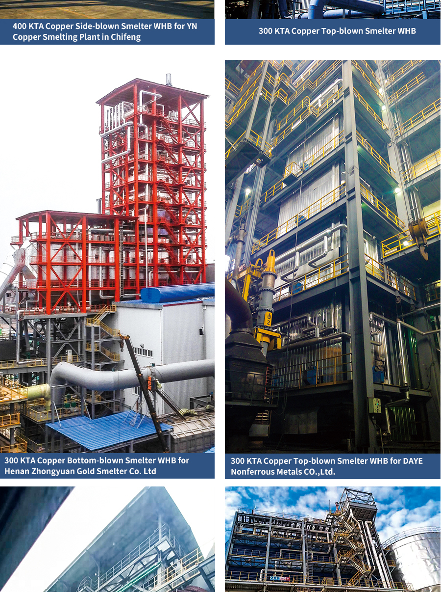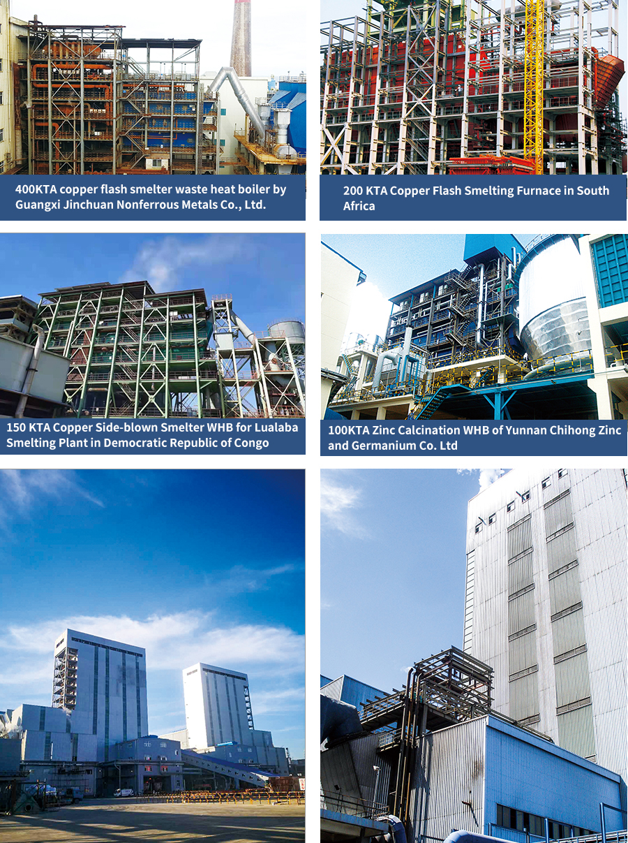 The waste heat boilers designed, manufactured and erected by our company serve major non-ferrous smelting enterprises at home and abroad, such as Jinchuan Group, Zijin Mining, Jiangxi Copper, China Copper, Yunnan Tin, Chihong Zinc and Germanium, etc., accounting for more than 90% of the non-ferrous market. Through years of painstaking research on waste heat boilers such as copper smelting (flash furnaces, side-blown furnaces, bottom-blown furnace, copper oxygen rich top-blown furnaces, Osmet furnaces, Isa furnaces, etc.), tin smelting (Osmet furnace waste heat boilers), lead and zinc smelting (Kifset furnaces, side-blown furnaces, bottom blown furnaces, fumigation furnaces, reduction furnaces, roasting furnaces, rotary kiln waste heat boilers) considering all kinds of smelting process characteristics, based on the characteristics of large dust content of flue gas, strong adhesion, strong corrosiveness and large fluctuation of flue gas cycle, the corresponding furnace type has been developed by our R&D team. With high technical content and reliable operation, it has gained high recognition and trust from customers at home and abroad.
