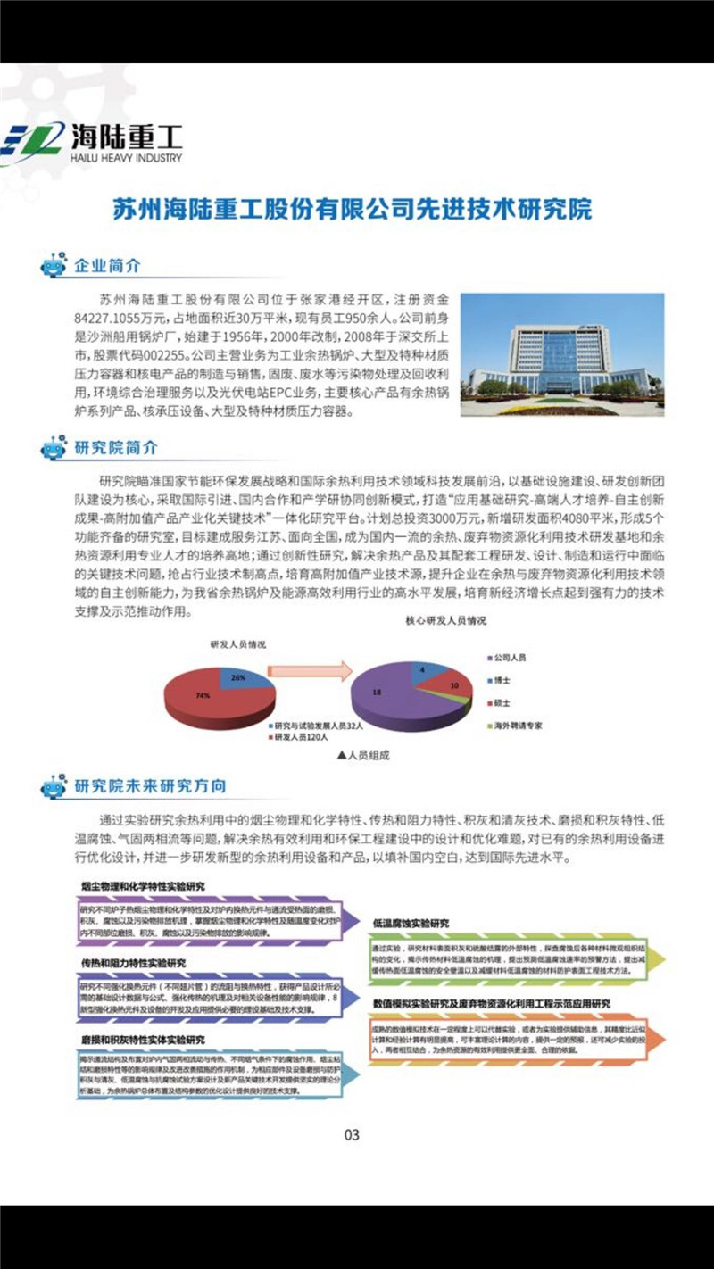 海陸重工一直秉承“科技領(lǐng)航,業(yè)界先鋒”的經(jīng)營理念,專注于流程工藝中余熱、廢熱回收與環(huán)保技術(shù)相結(jié)合的技術(shù)研發(fā),主營業(yè)務(wù)為主工業(yè)余熱鍋爐、大型及特種材質(zhì)壓力容器和核電產(chǎn)品的制造與銷售,固廢、廢水等污染物處理及回收利用,環(huán)境綜合治理服務(wù)以及光伏電站EPC業(yè)務(wù)。本公司先進(jìn)技術(shù)研究院瞄準(zhǔn)國家節(jié)能環(huán)保發(fā)展戰(zhàn)略和國際節(jié)能環(huán)保技術(shù)領(lǐng)域科技發(fā)展前沿,以基礎(chǔ)設(shè)施建設(shè)、研發(fā)創(chuàng)新團(tuán)隊(duì)建設(shè)為核心,采取國際引進(jìn)、國內(nèi)合作和產(chǎn)學(xué)研協(xié)同創(chuàng)新模式,打造“應(yīng)用基礎(chǔ)研究-高端人才培養(yǎng)-自主創(chuàng)新成果-高附加值產(chǎn)品產(chǎn)業(yè)化關(guān)鍵技術(shù)”一體化研究平臺(tái)。